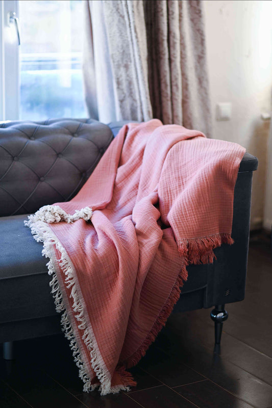 Double-Sided Muslin Blanket with Pillowcases (Coral Pink & Ecru)
